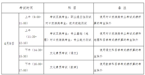 考试内容分文化素质考试和职业技能考试。总分为750分,其中文化素质考试满分300分,职业技能考试满分450分。报考考试五类的考生职业技能考试科目为专业基础考试、职业适应性测试;报考对口旅游类的考生职业技能考试科目为专业能力测试、技术技能测试。